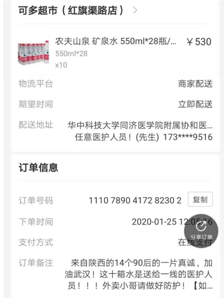 1月23日,疫情蔓延呈上漲趨勢,武漢“封城”后物資匱乏,各地各鎮府人民紛紛送去了物資力量,中陜核集團核昌黨委工作部幾位青年們亦立即行動起來,通過朋友圈、微信群、QQ群等渠道,組織號召朋友、家人參與進來,開展捐款購買礦泉水活動,送往武漢華中科技大學同濟醫學院附屬協和醫院金銀湖分院,大家快速行動,活動共捐助10280瓶礦泉水。小小的280瓶,帶著核昌青年及家人朋友對武漢同胞的祝福、對全體一線奮戰醫務人員的敬意、對國家抗擊疫情成功的信心前去抗疫一線,這份小小的力量有我們大大的祝福,希望能幫到他們,盼望正在一線奮斗患者和醫務人員都能平安歸來。